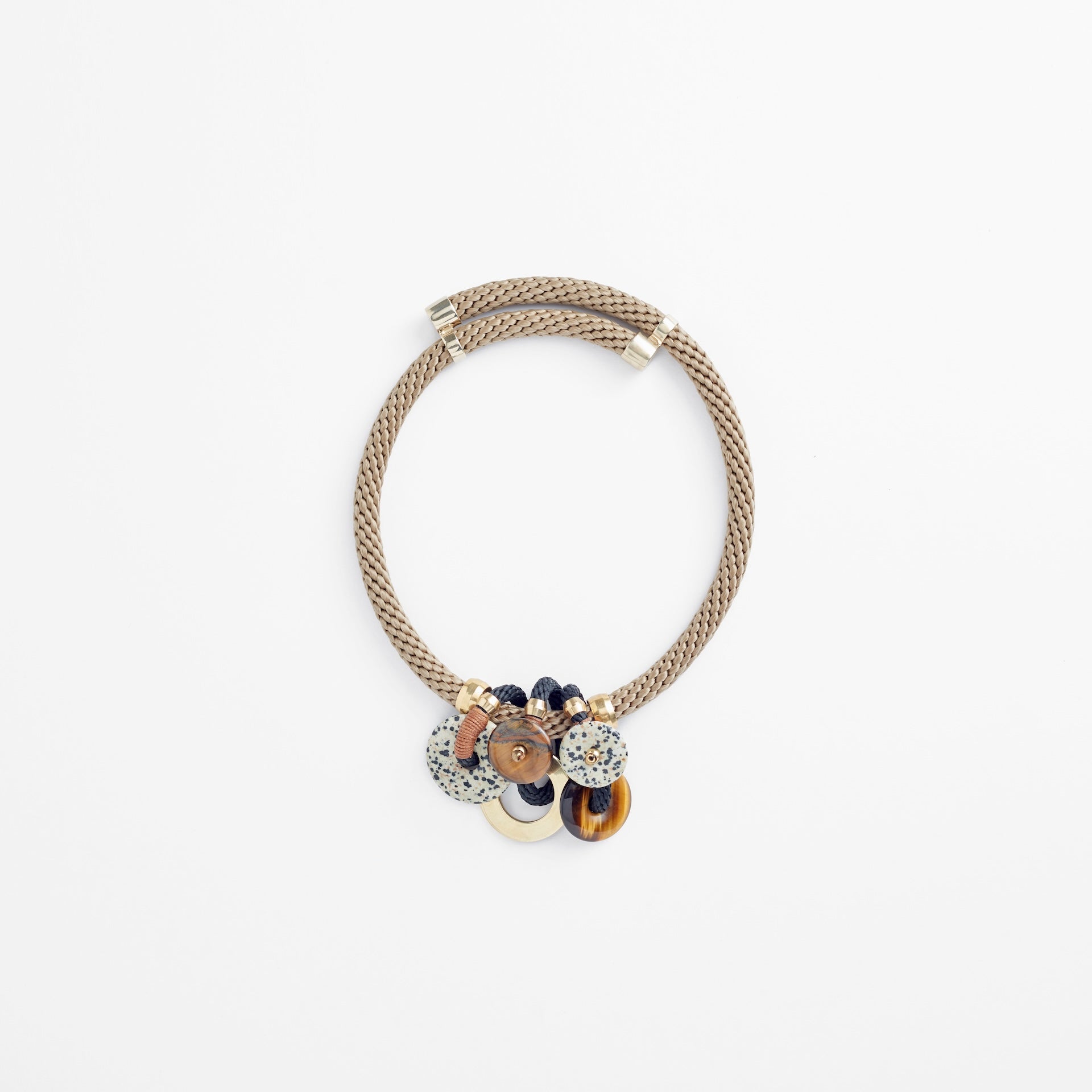 Braided rope embellished with red and dalmatian jasper stones, brass rings and a brass adjustable clasp.